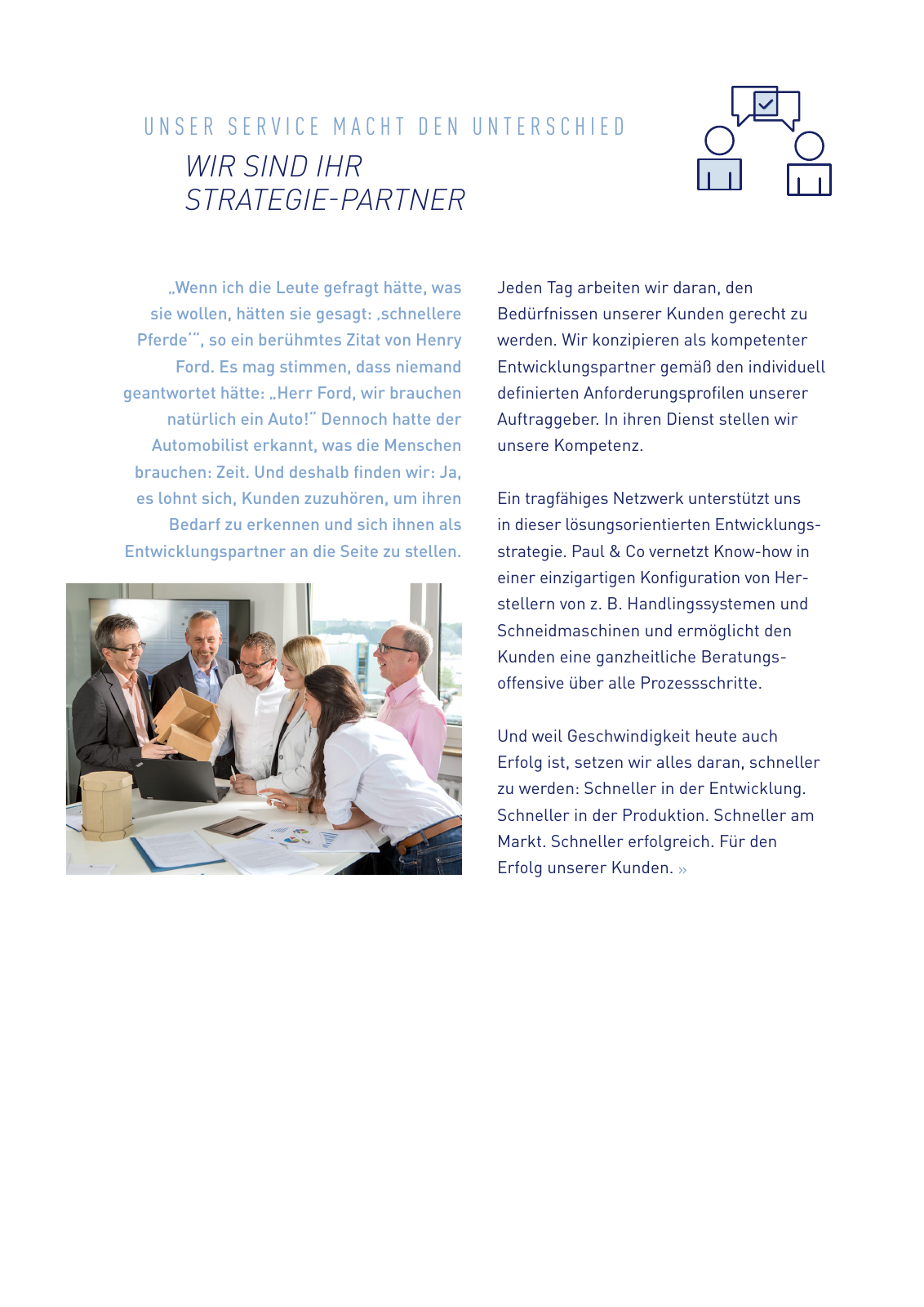 Jeden Tag arbeiten wir daran den Bedürfnissen unserer Kunden gerecht zu werden Wir konzipieren als kompetenter Entwicklungspartner gemäß den individuell definierten Anforderungsprofilen unserer Auftraggeber In ihren Dienst stellen wir unsere Kompetenz Ein tragfähiges Netzwerk unterstützt uns in dieser lösungsorientierten Entwicklungs strategie Paul Co vernetzt Know how in einer einzigartigen Konfiguration von Her stellern von z B Handlingssystemen und Schneidmaschinen und ermöglicht den Kunden eine ganzheitliche Beratungs offensive über alle Prozessschritte Und weil Geschwindigkeit heute auch Erfolg ist setzen wir alles daran schneller zu werden Schneller in der Entwicklung Schneller in der Produktion Schneller am Markt Schneller erfolgreich Für den Erfolg unserer Kunden U N S E R S E R V I C E M A C H T D E N U N T E R S C H I E D WIR SIND IHR STRATEGIE PARTNER Wenn ich die Leute gefragt hätte was sie wollen hätten sie gesagt schnellere Pferde so ein berühmtes Zitat von Henry Ford Es mag stimmen dass niemand geantwortet hätte Herr Ford wir brauchen natürlich ein Auto Dennoch hatte der Automobilist erkannt was die Menschen brauchen Zeit Und deshalb finden wir Ja es lohnt sich Kunden zuzuhören um ihren Bedarf zu erkennen und sich ihnen als Entwicklungspartner an die Seite zu stellen